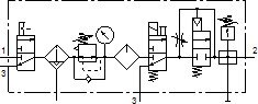 KonštrukciaOdbočovací modul, Tlakový spínač, Zapínací / Vypínací ventil, Regulátor filtra s manometrom, Bezpečnostný zapínací ventil, Proporcionálna štandardná olejnička