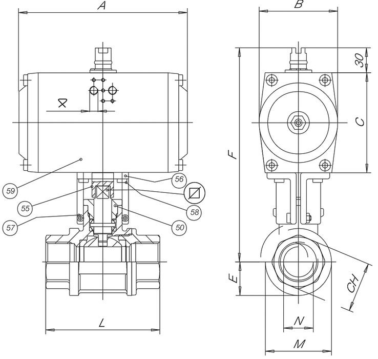 - Pneumaticky ovládané prírubové guľové kohúty