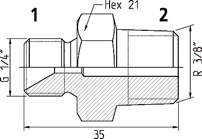 PopisVonkajší závit: Prípoj 1 s 60° vnútorným kužeľom, prípoj 2 so závitom 3/8" NPT (Maximálny pracovný tlak s gumokovovým tesnením 100 MPa)