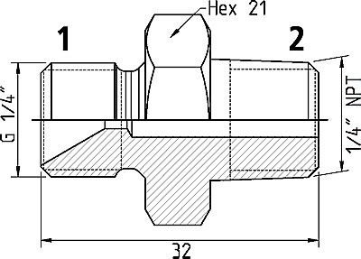 PopisVonkajší závit: Prípoj 1 s 60° vnútorným kužeľom, prípoj 2 so závitom 1/4" NPT (Maximálny pracovný tlak s gumokovovým tesnením 100 MPa)